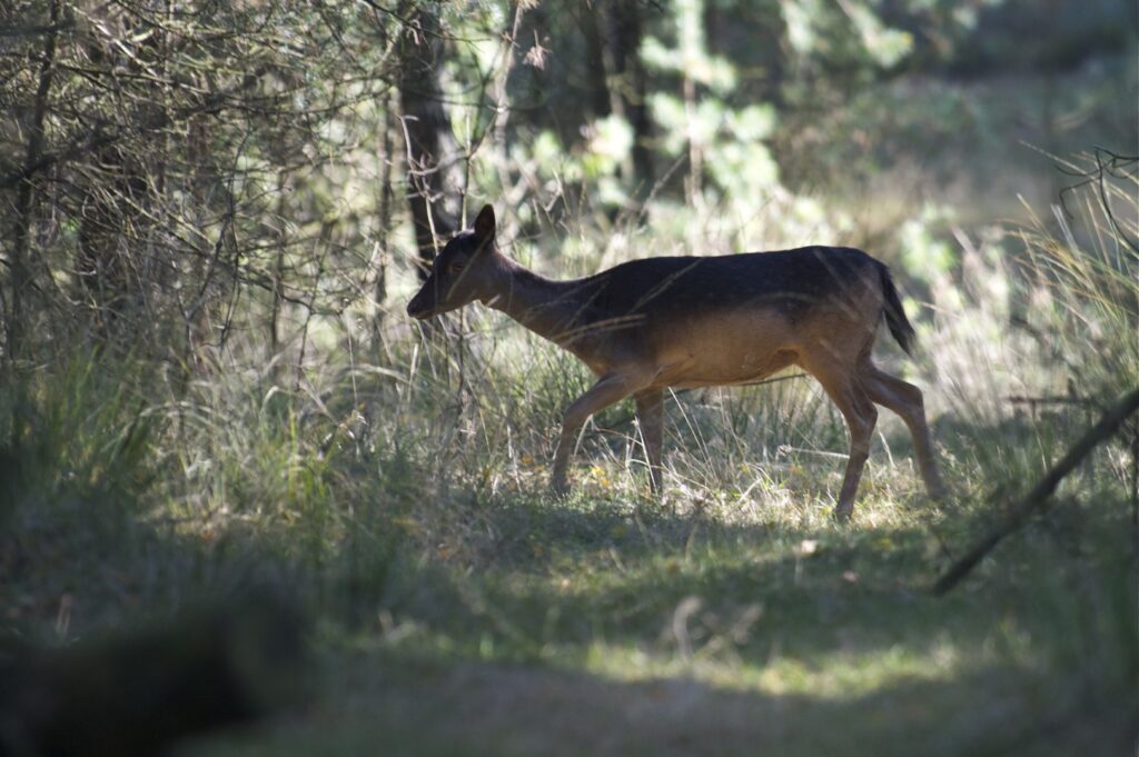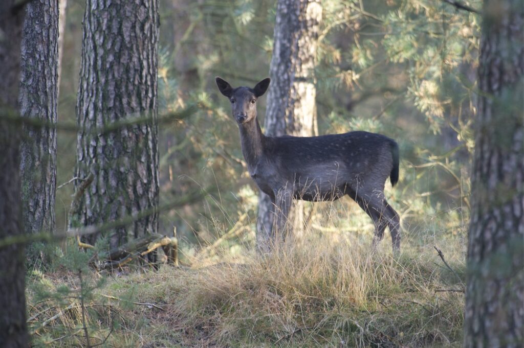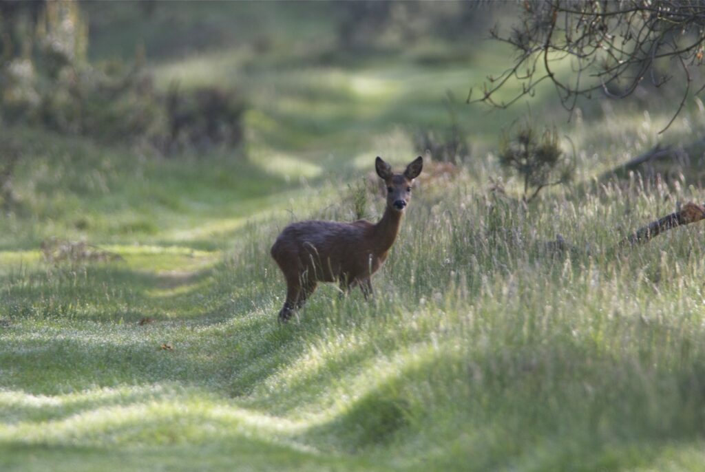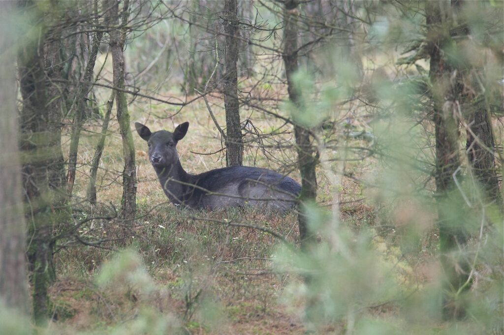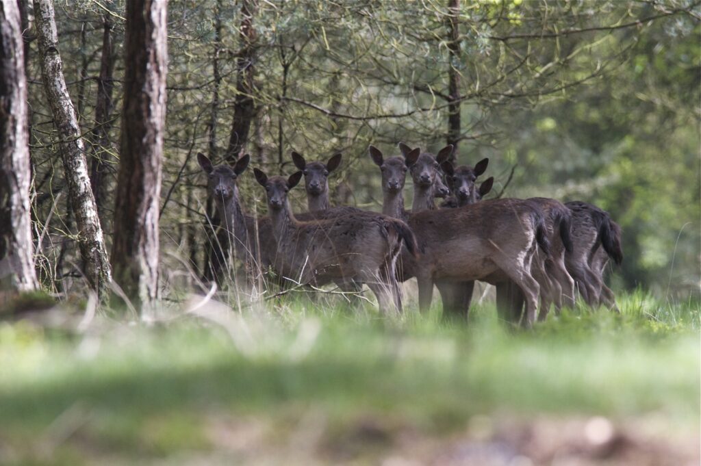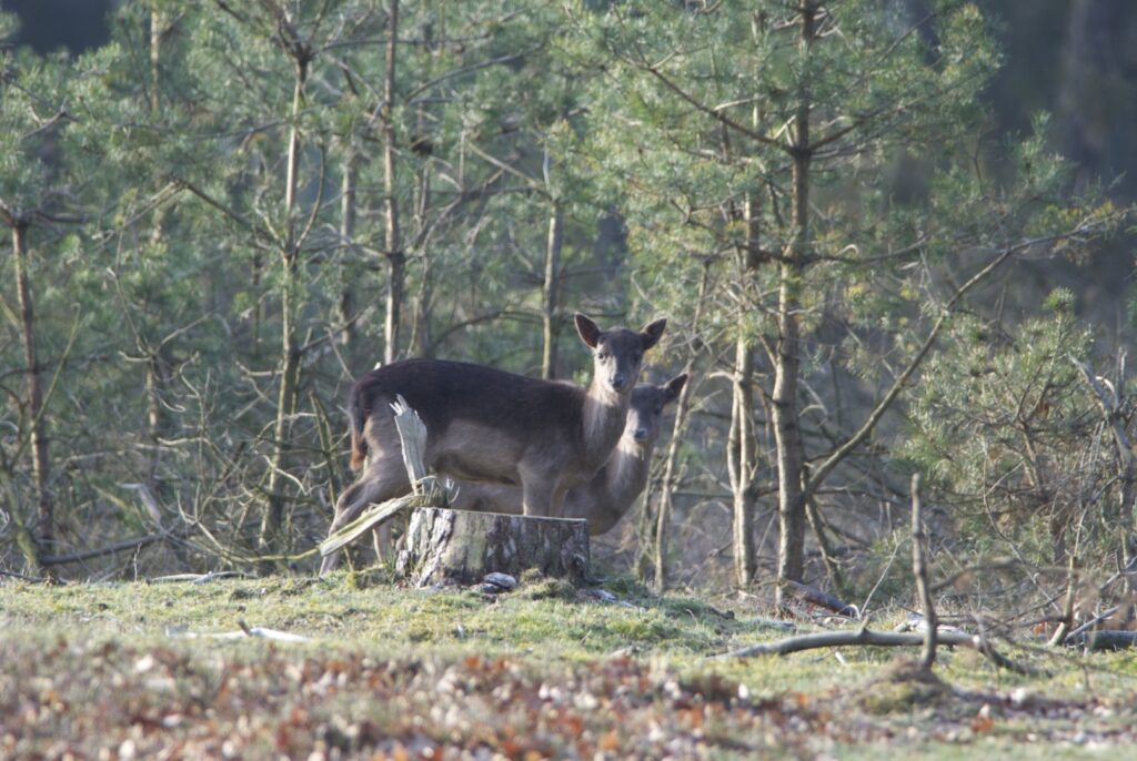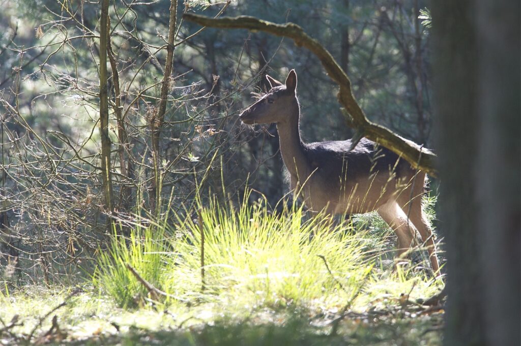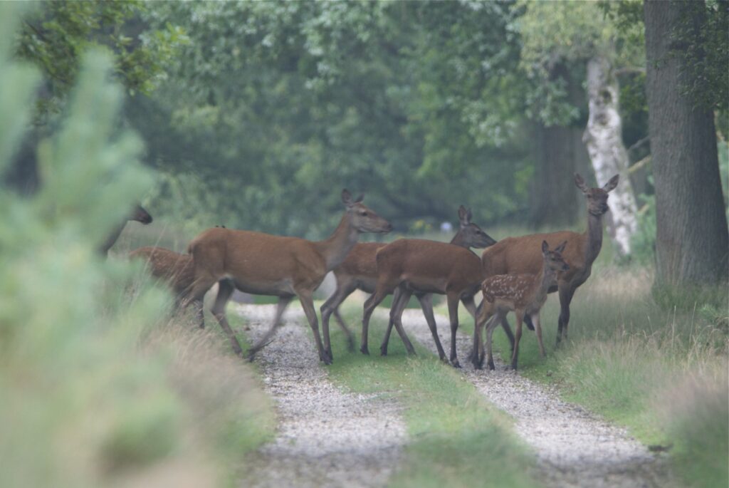 In juni, na een draagtijd van ongeveer 230 dagen, zoekt de hinde een goed beschutte plek in het bos om haar kalf te zetten. Doorgaans wordt er één kalf geboren en zelden twee. Het gewicht is tussen de vier en vijf kilogram. Het nagenoeg geurloze kalf wordt door de hinde alleen gelaten, goed verscholen in de dekking. Wel blijft zij in de buurt. Het kalf geeft zo weinig geur af dat vossen en andere predatoren het kalf nauwelijks kunnen vinden. Geregeld keert de hinde bij het kalf terug om het te zogen en te verzorgen. De zoogtijd is zo’n drie maanden. De kalveren blijven tot ongeveer anderhalf jaar bij de hinde.
