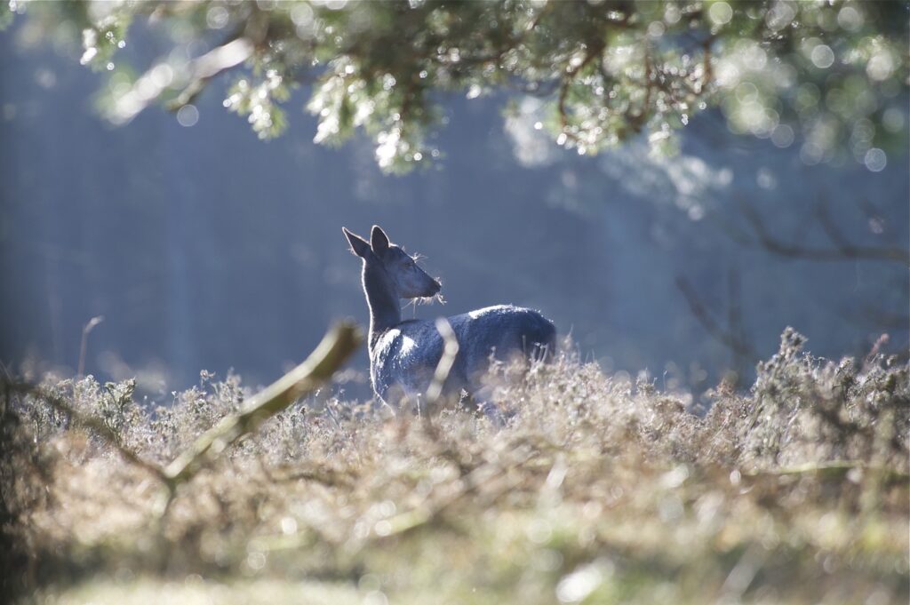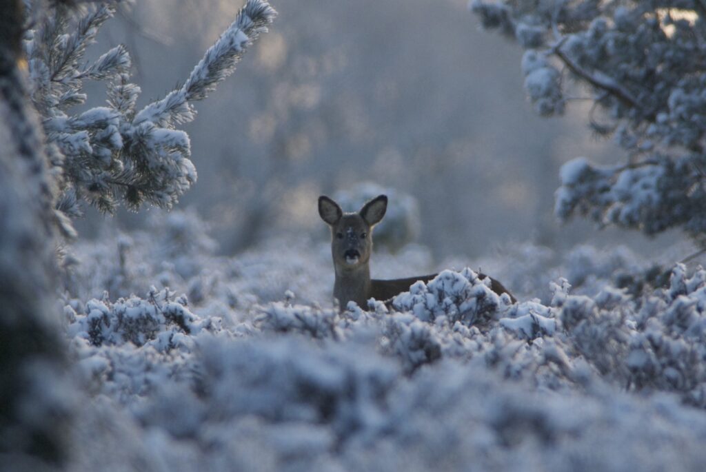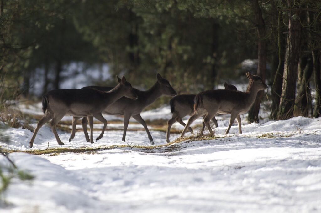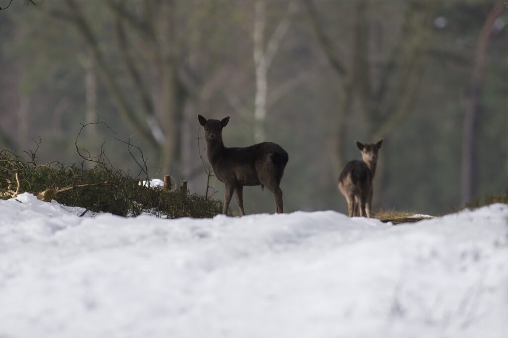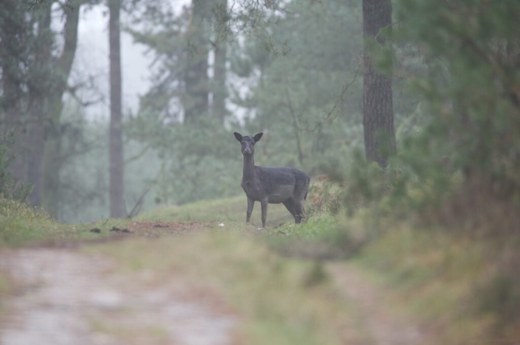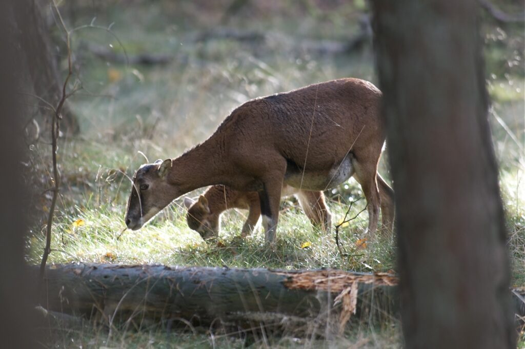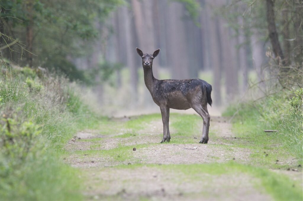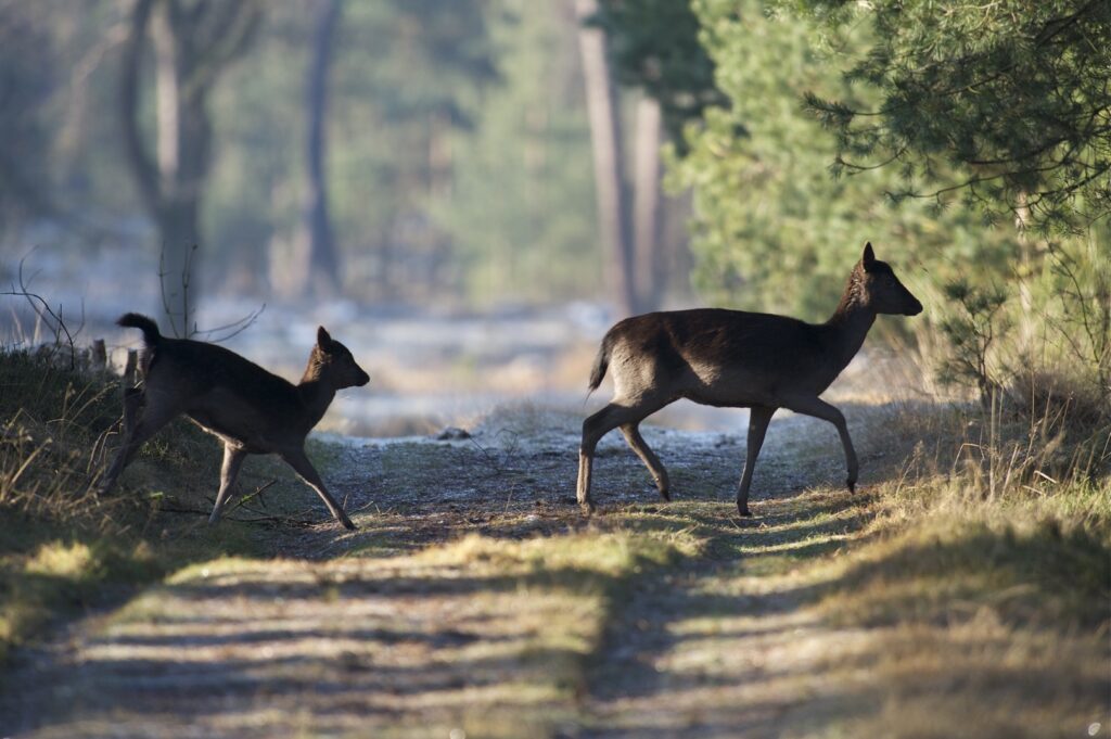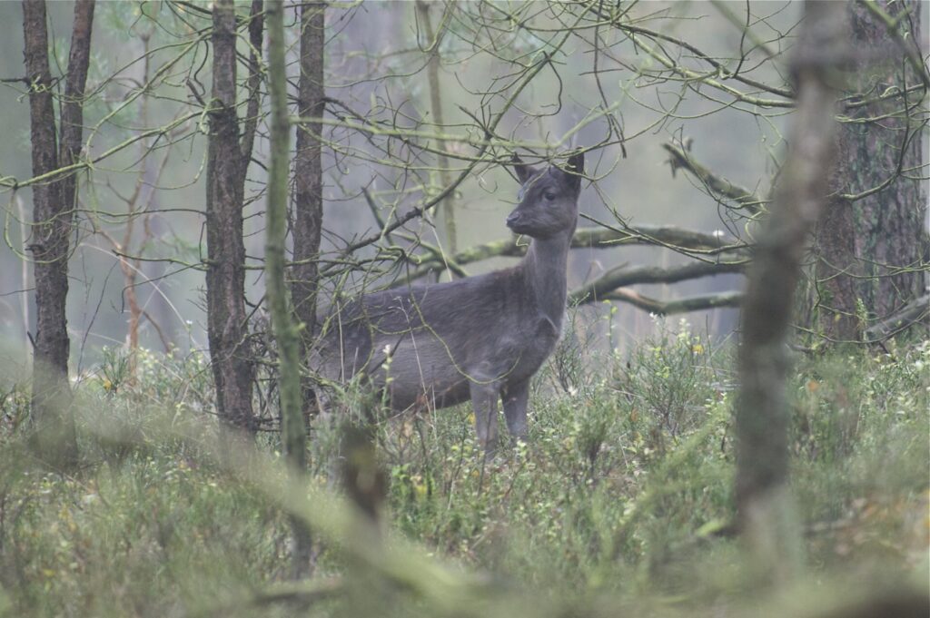 In juni, na een draagtijd van ongeveer 230 dagen, zoekt de hinde een goed beschutte plek in het bos om haar kalf te zetten. Doorgaans wordt er één kalf geboren en zelden twee. Het gewicht is tussen de vier en vijf kilogram. Het nagenoeg geurloze kalf wordt door de hinde alleen gelaten, goed verscholen in de dekking. Wel blijft zij in de buurt. Het kalf geeft zo weinig geur af dat vossen en andere predatoren het kalf nauwelijks kunnen vinden. Geregeld keert de hinde bij het kalf terug om het te zogen en te verzorgen. De zoogtijd is zo’n drie maanden. De kalveren blijven tot ongeveer anderhalf jaar bij de hinde.