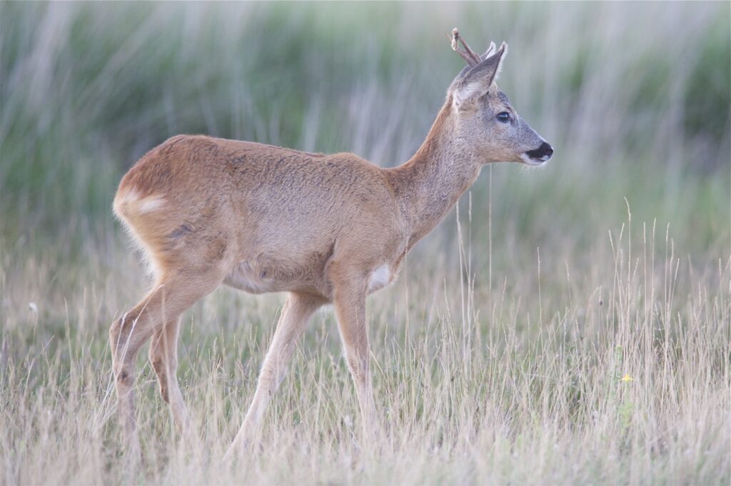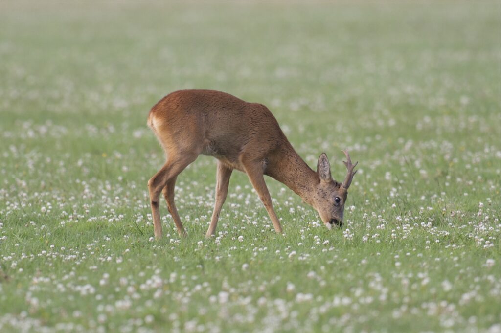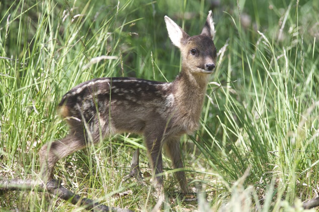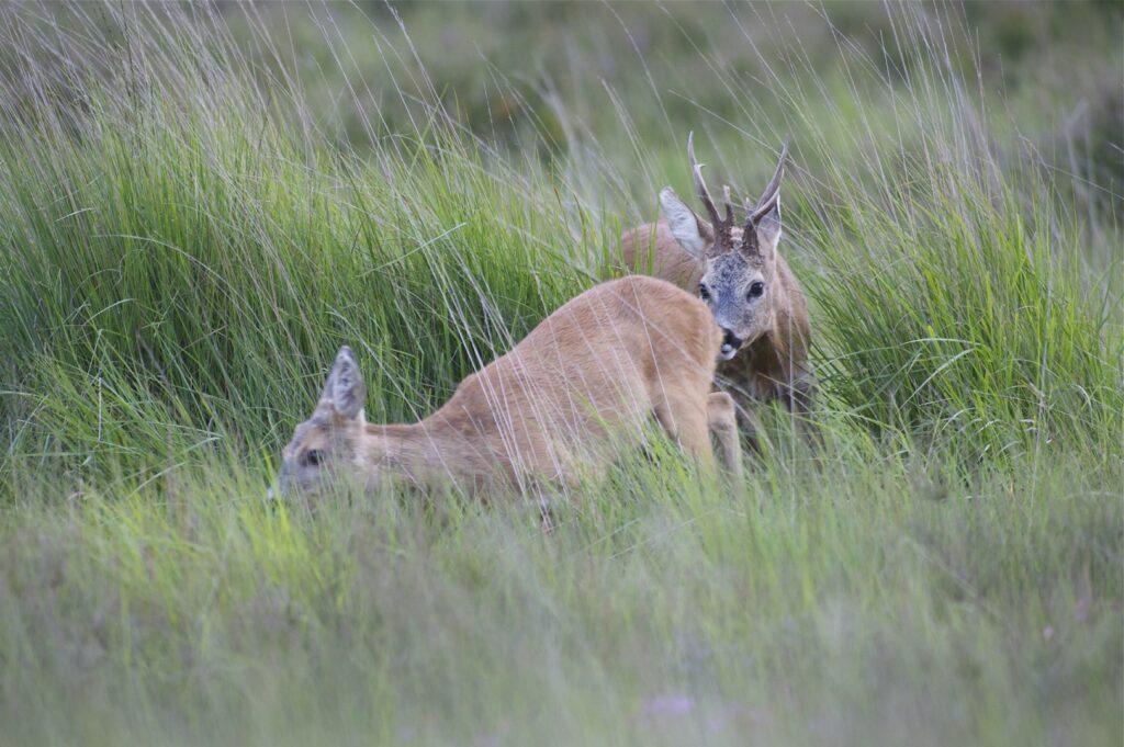 In mei/juni, na een draagtijd van ongeveer acht maanden, zonder de hinde zich af en wordt haar kalf geboren; doorgaans één, maar er komen ook tweelingen voor. Ter camouflage heeft de vacht lichte tot witte vlekken. Hoewel een hertenkalf al na korte tijd kan lopen, is het nog niet in staat om de hinde te volgen. De eerste één tot twee weken laat de hinde het kalf goed verscholen in de dekking of het hoge gras ‘alleen’. Ze blijft in de buurt en komt verschillende keren per dag het kalf zogen. Bij gevaar blijft het kalf onbeweeglijk liggen. Na tien tot veertien dagen is het kalf sterk genoeg om de hinde te volgen en sluit zich aan bij de kaalwildroedel. Het kalf wordt tot wel tien maanden gezoogd. Tegen het einde van de zomer zijn over het algemeen de vlekken bij het kalf verdwenen.